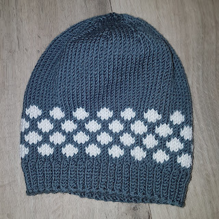 Tantegullet fikk en ny lue før juleferien min var over. Har brukt Merinoull fra Sandnesgarn. Gikk under ett 50 grams nøste med blått og så hadde jeg en rest med hvit fra en lue jeg strikket i sommer.